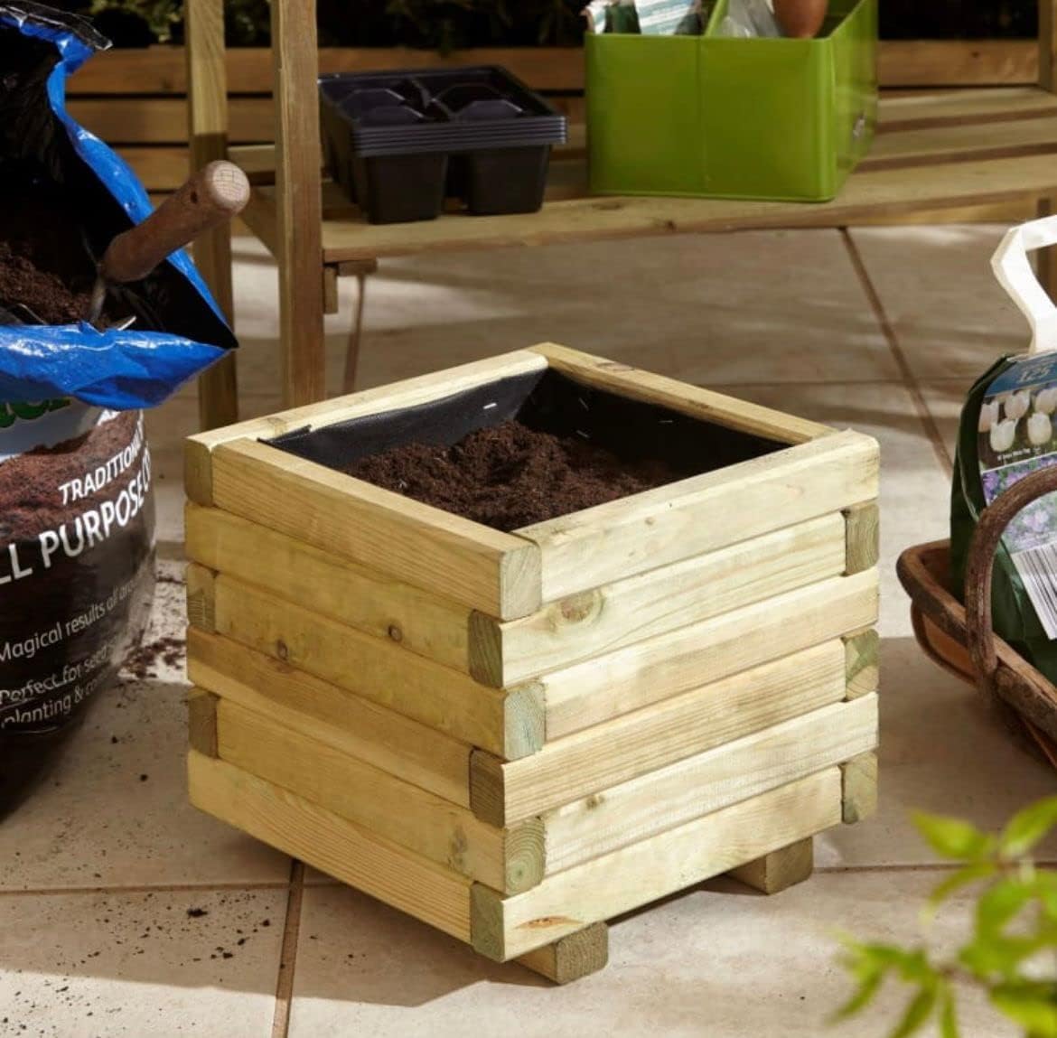AAMEN Square Wooden Planter Box – Natural Timber Finish, Durable Hardwood for Outdoor Gardens & Patios